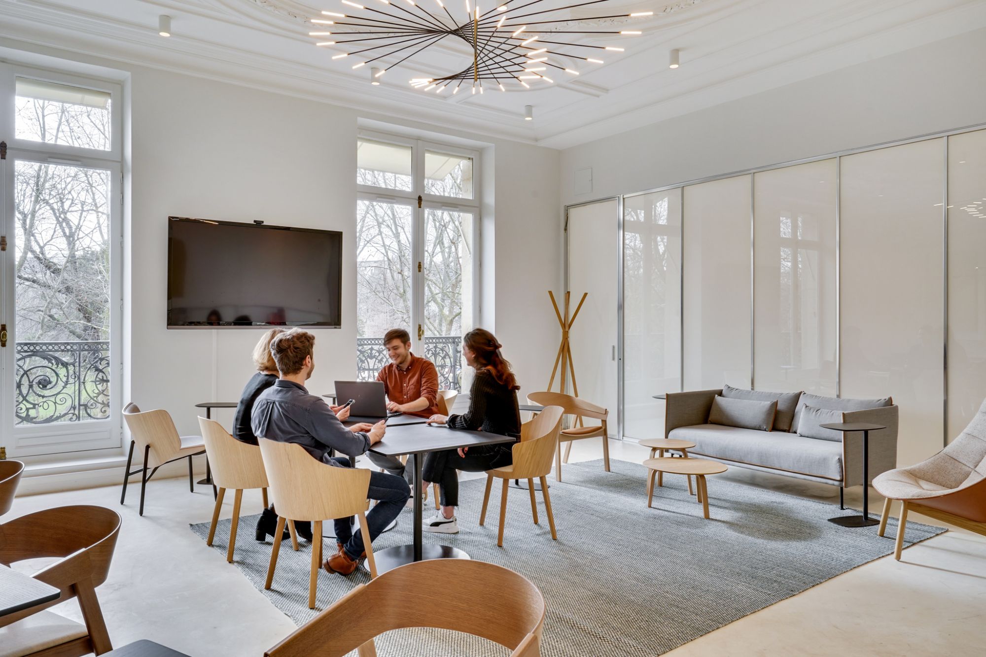C'est pourquoi certains espaces sont modulables, en particulier le Workcafé, pièce maîtresse qui permet de multiples usages, allant de la détente à l'événement, en passant par la réunion, le tout étant optimisé par un vitrage Priva-Lite, un verre à occultation commandée.